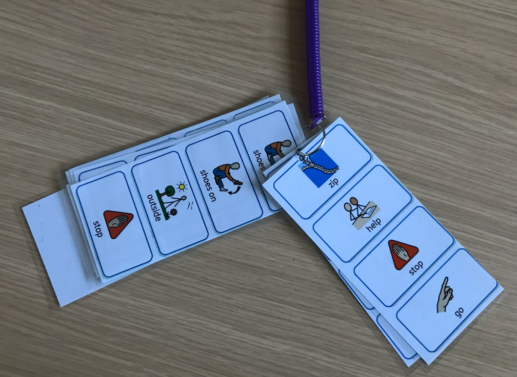 We have a group of 7 pupils with complex communication needs taught within the same classroom who are all beginning to use symbol exchanges for communication. However, to do this properly you need two staff per child which isn’t possible so we have agreed on 5 action words to focus on for the next few weeks. This includes visuals, Makaton actions and also the spoken word to develop a total communication approach. To ensure consistency, we have shared this with all staff working with the pupils, they have the visuals on the lanyards and also in different areas within the classroom and lunchroom etc.